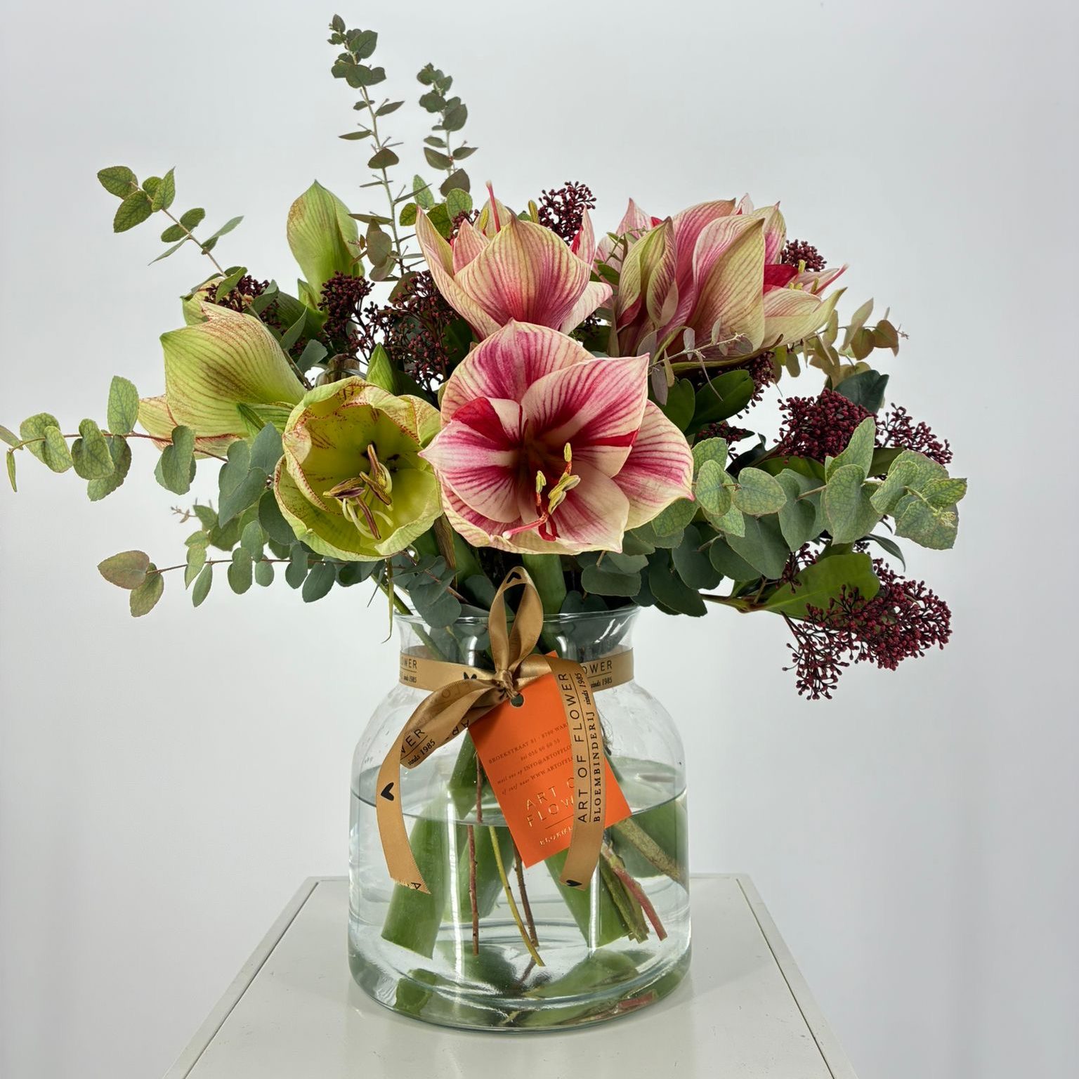 Dit amaryllisboeket is altijd een bijzondere keuze. De lange, stevige stelen maken het bovendien ideaal voor een elegante, hoge vaas, waar de majestueuze bloemen volledig tot hun recht komen.